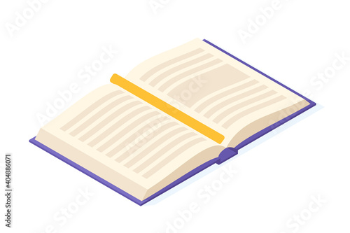 Open book isometric. Paper pages with text, picture and bookmark for education and reading concept.