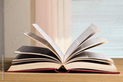 Open book on old wooden table.