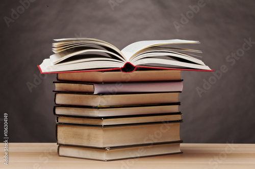 Open book on table and gray background and copy space