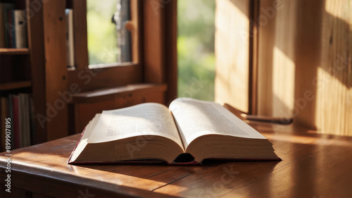 Open Book on Wooden Desk with Sunlight Through Window in Cozy Library - Relaxation and Learning