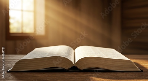 Open Book on Wooden Table with Sunlight Streaming Through Window