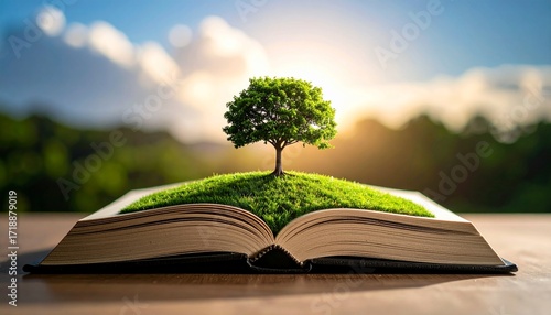 Open Book Revealing a Miniature Green Landscape with Small Tree