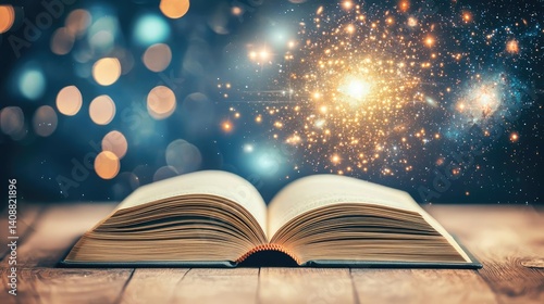 Open book under starry sky with galaxy and cognition concept. An open book reveals cosmic wonders and limitless imagination.