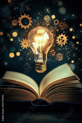 Open Book with a Light Bulb and Gears, Representing New Ideas, Knowledge, and Innovation