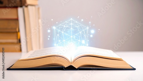 Open book with glowing geometric shape emerging, representing knowledge, education, and technology in a modern learning environment