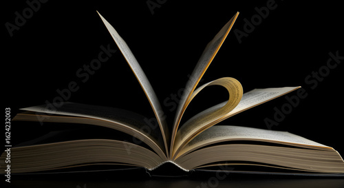 Open Book with Heart-Shaped Page on Dark Background, Symbolizing Love for Reading and Knowledge