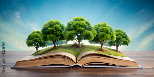 Open book with miniature island of trees emerging, blending nature and literature creatively, fantasy, imagination, creativity
