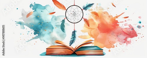 Open book with pages spread wide and a beautiful dream catcher placed carefully on top of the pages
