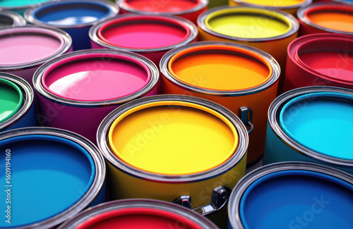 Open cans of colorful paint arranged in a pattern with vibrant shades of pink, yellow, blue, green, orange, and red