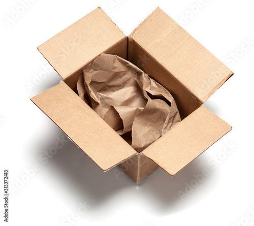 Open cardboard box with wrapping paper inside. Isolated on a white background. Top view. mock-up.