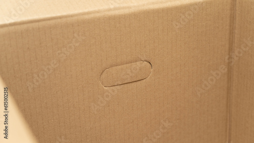 open cardboard boxes close-up, cutout for handle in cardboard box