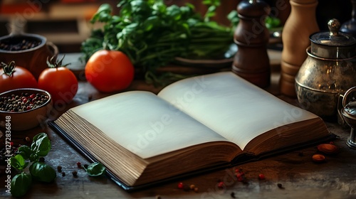 Open Cookbook with Fresh Ingredients on Rustic Wood Table Ready for Recipes