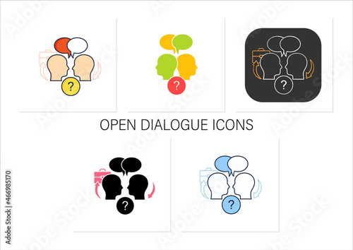 Open dialogue icons set. Dispute resolution.Compromising. Successfully handles, resolves issues sensibly and fairly.Collection of icons in linear, filled, color styles.Isolated vector illustrations