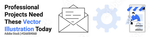 Open envelope with letter, gear symbolizing settings, and storefront with seller managing orders. Ideal for communication, technology, business, e-commerce, marketing, workflow flat landing page