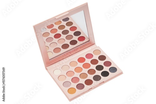Open eyeshadow palette with multiple colors and a mirror on a white background angled view