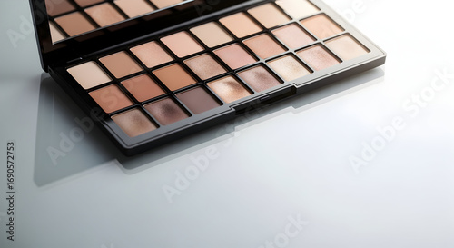 Open Eyeshadow Palette with Neutral Tones Displayed on Reflective Surface