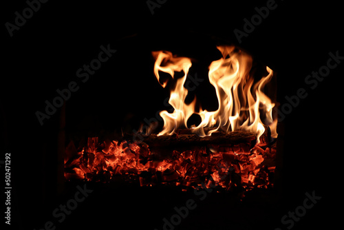 open fire in the fireplace with red hot coals closeup wallpaper