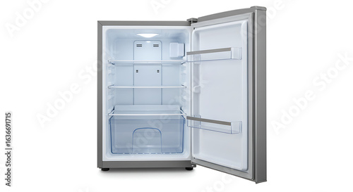 Open Gray Refrigerator with Empty Shelves Isolated on White Background, Ready for Groceries and Fresh Food Storage Solution