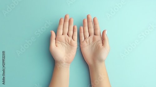 Open hands on light teal background