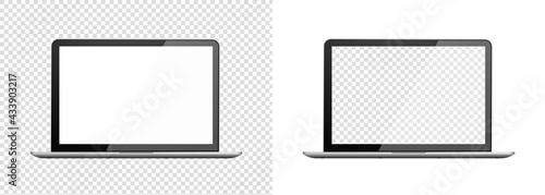 Open laptop mock up. Personal computer mockup front view. Portable gadget with blank screen silver color