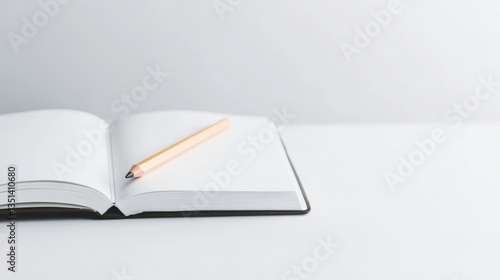 open notebook lies on clean white surface single pencil positioned diagonally across its blank pages