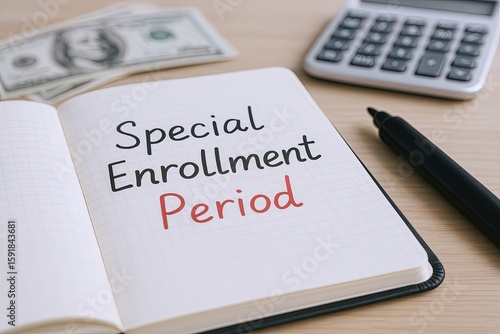 Open notebook with handwritten text special enrollment period on a wooden desk with calculator and money.