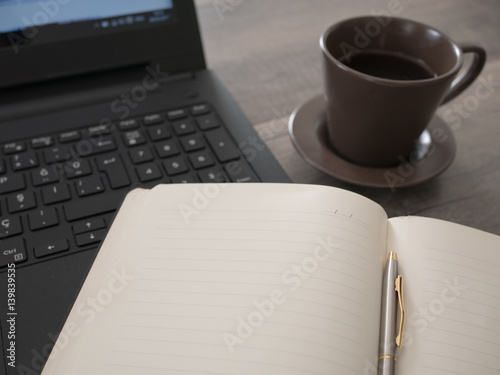 Open notebook with laptop and coffee, working concept