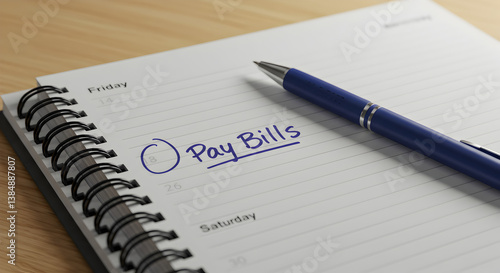Open Notepad on Wooden Table with Pay Bills Written in Blue Ink and Ballpoint Pen