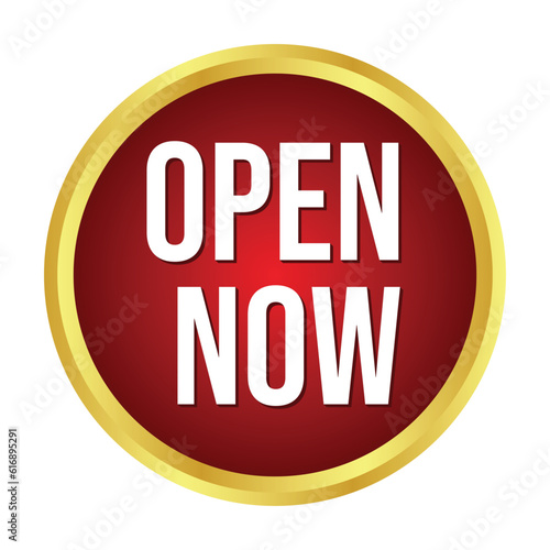 Open Now Rubber Stamp, Label, Emblem, Seal, Sticker, Patch, Banner, Design Element, 3D Realistic Shiny And Glossy Badge Design Vector Illustration