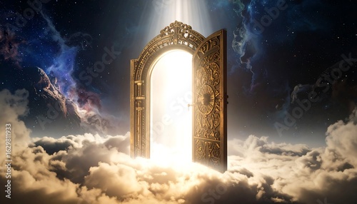 Open Ornate Doorway Above Clouds with Bright Light and Stars