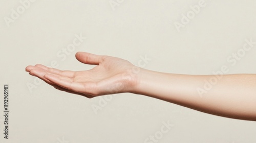 Open palm hand outstretched, arm extended against a neutral background.