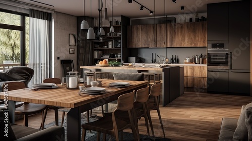Open plan living and kitchen with wood accents