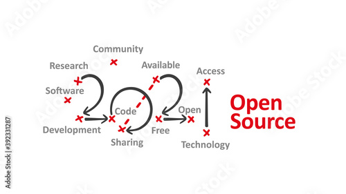 Open Source New Year 2021 word cloud black arrows red marks white background vector