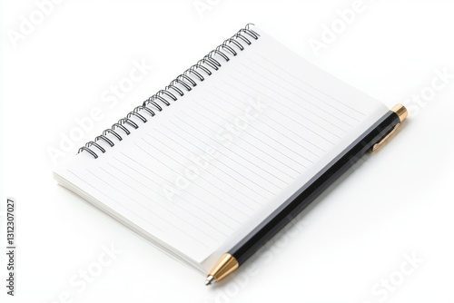 Open spiral notebook with a black pen on a white background, ideal for office, school, or creative projects.
