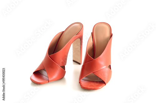 Open toe criss cross leather mule shoes isolated on white background. Fashion heels shoes, terracotta color..