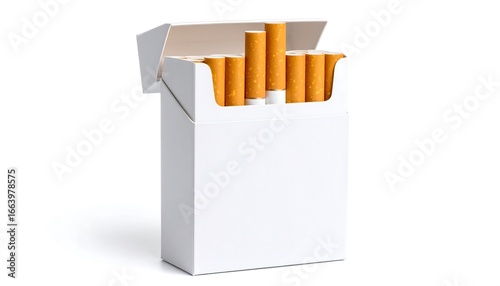 Open White Pack of Cigarettes with Filtered Tobacco Sticks on White Background.