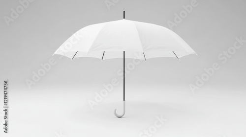 open white umbrella stands prominently against blank white background, creating minimalist and serene atmosphere. This evokes feelings of calmness and simplicity