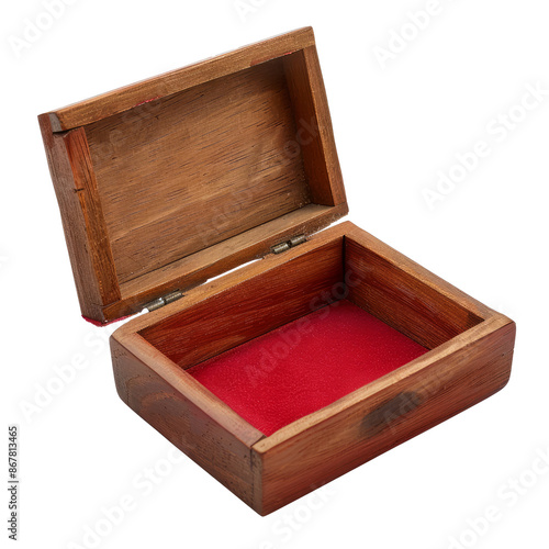 Open Wooden Box with Red Velvet Interior - Antique Storage Container with Hinged Lid and Decorative Detailing, cut out transparent