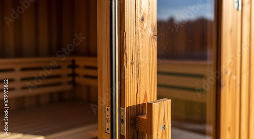 Open wooden door reveals inviting empty sauna interior with warm sunlight highlighting smooth wooden benches and serene natural textures for calm relaxation atmosphere