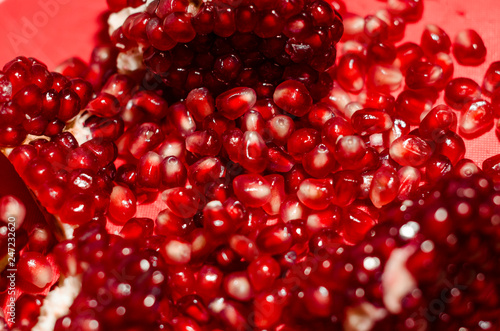 Opened and cutted pomegranate on the red board