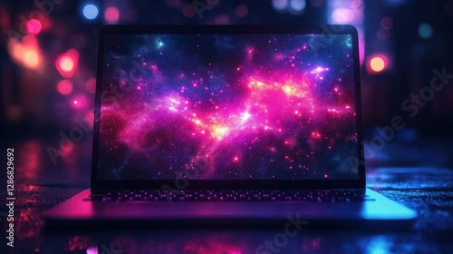 Opened blank laptop with colorful gears intersecting over screen, dark background