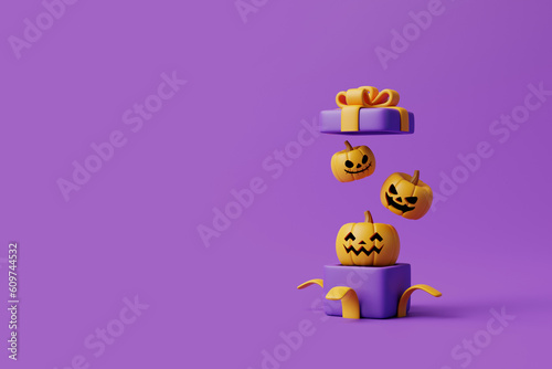 Opened gift box with Halloween Jack-o-Lantern pumpkins on purple background. Happy Halloween concept. Traditional october holiday. 3d rendering illustration