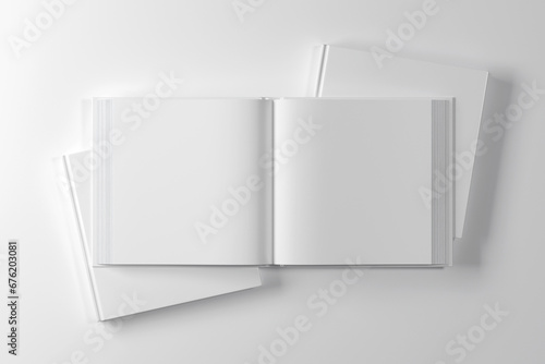 Opened square hardcover book mockup. 3D rendering