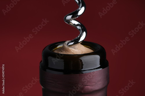 Opening bottle of wine with corkscrew on burgundy background, closeup