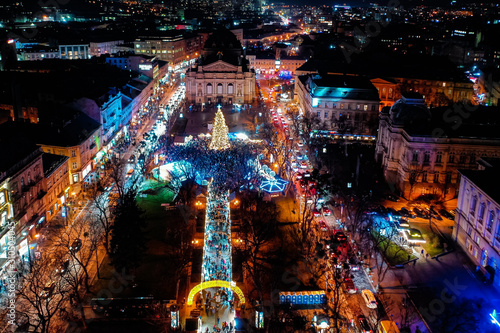 Opening of Christmas tree near Opera House in Lviv, Ukraine. View from drone