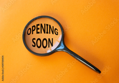 Opening soon symbol. Magnifying Glass with Concept word Opening soon. Beautiful orange background. Business and Opening soon concept. Copy space