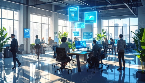 Open-plan office with employees using AI assistants and holographic productivity tools