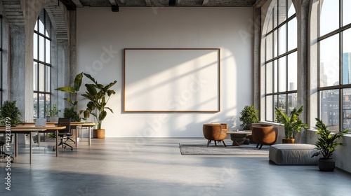 Open-Plan Office with Large White Wall, Desks, Chairs, and Concrete Floor