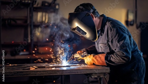 operaio che salda su un banco d'officina. Immagine realistica e dettagliata