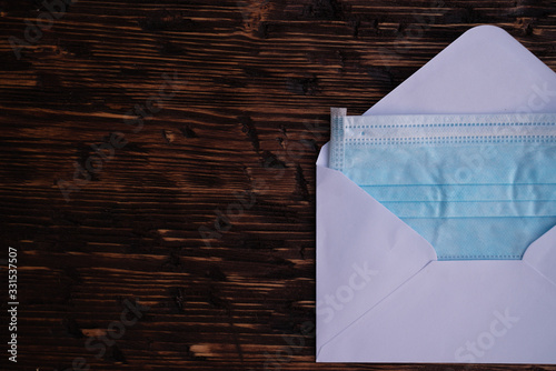 Operating mask in an envelope on a wooden background